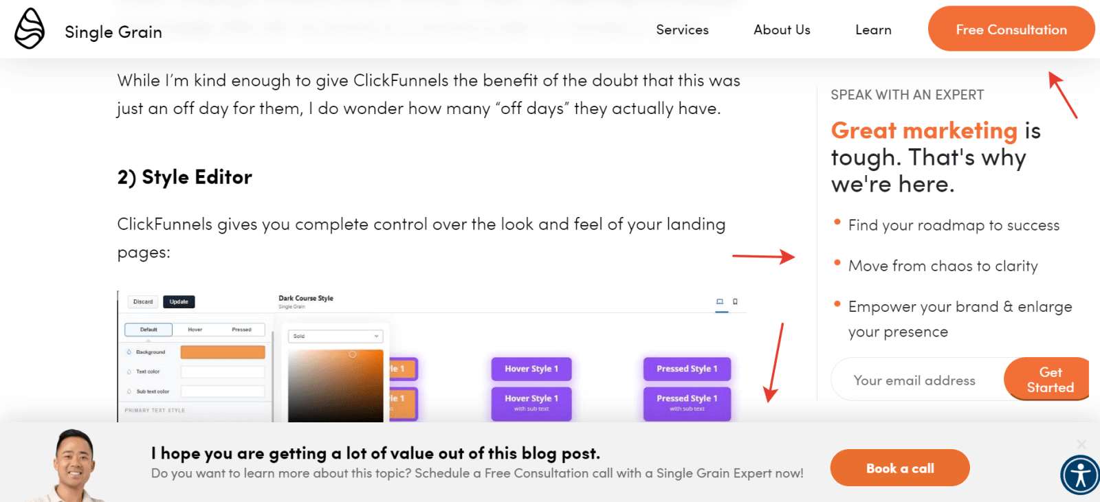 Проще всего прописывать призывы в тексте: не нужно привлекать программистов и дизайнеров. Достаточно поставить ссылку. Такой подход работает, если ваши статьи читают вдумчиво. Однако если вы посмотрите на тепловые карты страниц сайта и время посещения, обнаружите закономерность. Посетители зачастую сканируют тексты. Бегло просматривают их в поиске нужной информации.