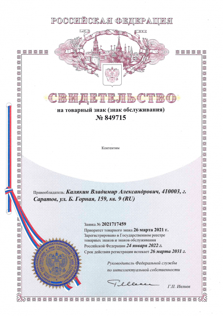 Правообладатель: Калякин Владимир Александрович >> ООО «Контентим»